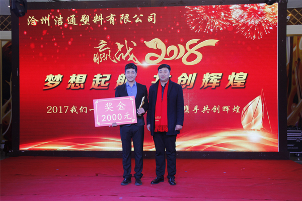 冬去春回又一載,似水流年旺年來。2018年2月12日下午,滄州潔通塑料有限公司2017年年會在正達大西洋酒店隆重舉行。潔通公司全體員工歡聚一堂,在熱情、溫馨、歡樂的氣氛中回首2017年取得的成績,共同迎接2018年的到來。